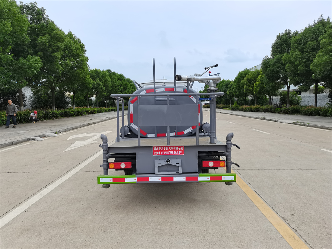 灑水車前裝有鴨形噴嘴或圓頭沖嘴,后面裝有圓柱開灑水噴嘴或蓮蓬頭噴嘴,后部有一工作平臺,裝配有水炮。后部還可裝8個噴嘴(選裝)。