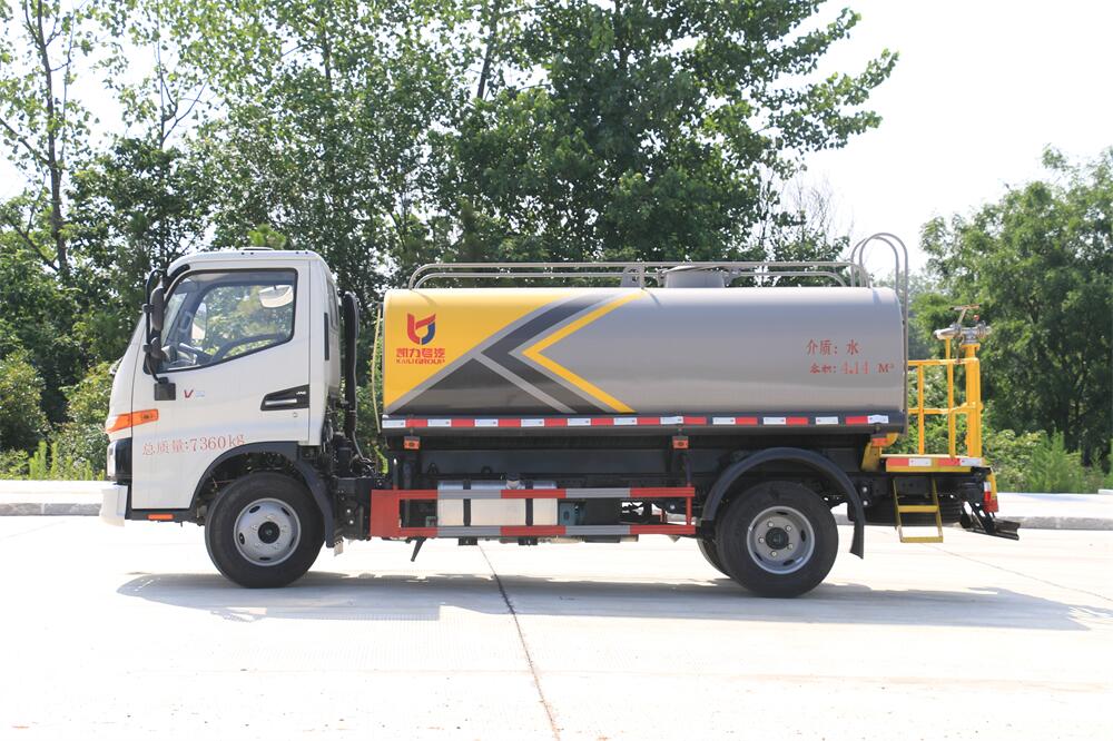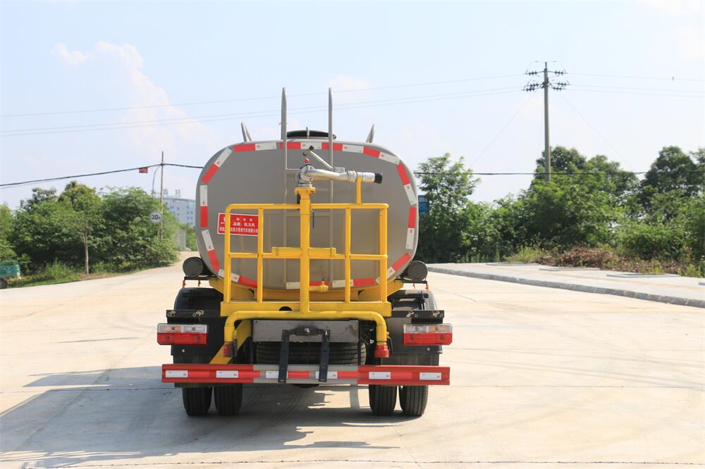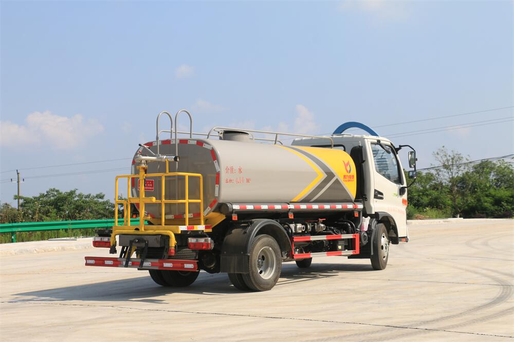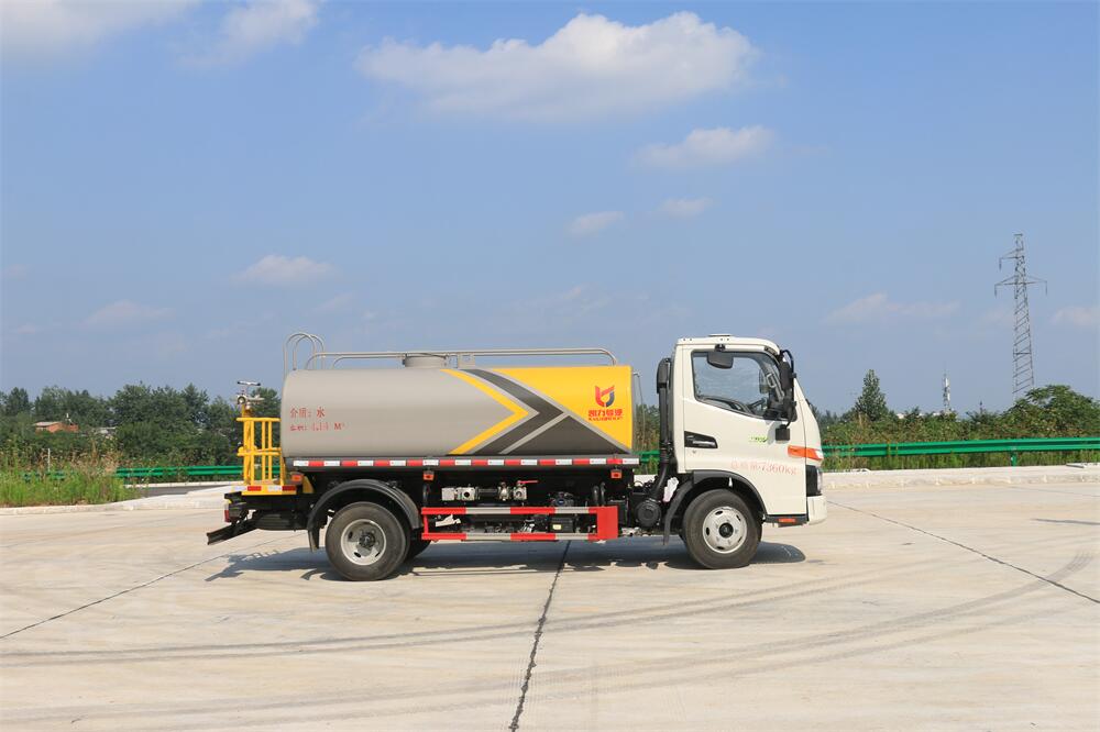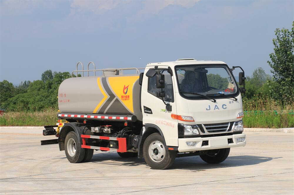 灑水車前裝有鴨形噴嘴或圓頭沖嘴,后面裝有圓柱開(kāi)灑水噴嘴或蓮蓬頭噴嘴,后部有一工作平臺(tái),裝配有水炮。后部還可裝8個(gè)噴嘴(選裝)。