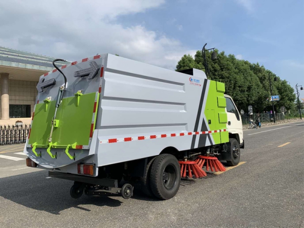 1.采用吸掃混合的方式收集垃圾,濕式除塵、電液,液壓傾翻卸料的作業(yè)方式對(duì)路面進(jìn)行清掃作業(yè)。