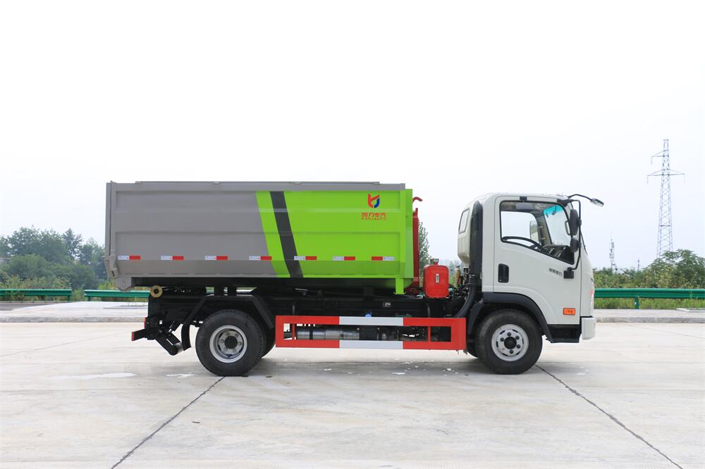 該款鉤臂式垃圾車由液壓系統、操作系統組成。舉升油制缸(1支)系國內知名液壓件廠家生產的雙作用油缸。垃圾廂可自吊上放下,可自行傾倒垃圾,上下一次工作循環時間≤50S。該車的特點是一個車能配多個垃圾廂,能實現一臺車與多個垃圾廂聯合作業,循環運輸,充分提高了車輛的運輸能力。