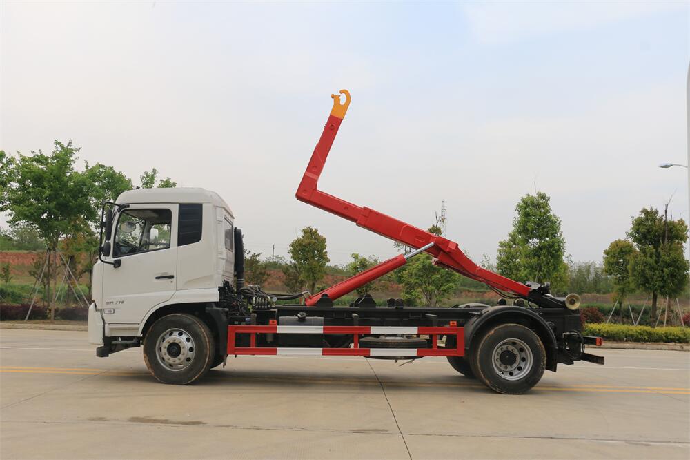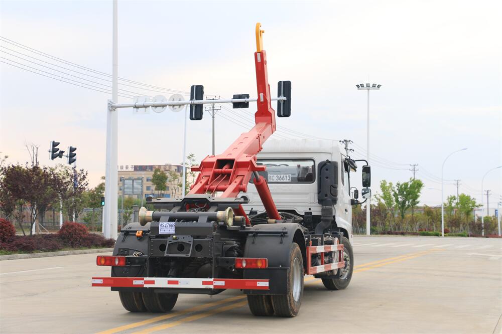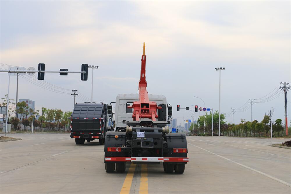 勾臂式垃圾車(車廂可卸式垃圾車)介紹: 車廂可卸式垃圾車又叫拉臂式垃圾車,是一種采用高新設(shè)計(jì)可伸縮的鉤臂,實(shí)現(xiàn)垃圾廂的二次吊裝,自吊上放下,可自行傾倒垃圾的環(huán)衛(wèi)設(shè)備。 拉臂式垃圾車結(jié)構(gòu)簡單,操作穩(wěn)定方便,裝卸效率高,機(jī)械化程度高,節(jié)省人力。鉤臂垃圾車一車可帶多個(gè)垃圾廂,在裝卸的運(yùn)輸過程中可有效地避免二次污染。 拉臂垃圾車采用高新設(shè)計(jì)可擺動(dòng)的鉤臂,垃圾箱由框架、開啟油缸、滑輪、后門和若干加強(qiáng)框架與鋼板焊接而成。調(diào)換貨廂快捷方便,貨廂上帶蓋(倒垃圾時(shí)可翻開),鉤臂垃圾車?yán)鴰w可選用碳鋼、不銹鋼材質(zhì)、內(nèi)部采取環(huán)氧樹脂防腐處理,改裝部分與原車底盤為可分離式,維修方便且保持了原車的機(jī)動(dòng)性及行駛性能。