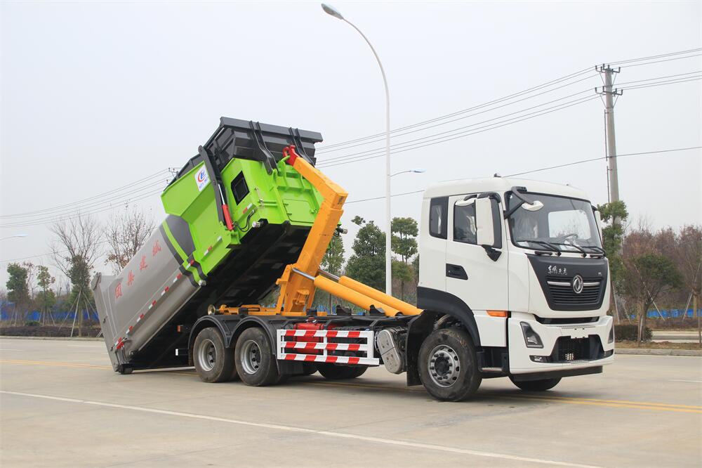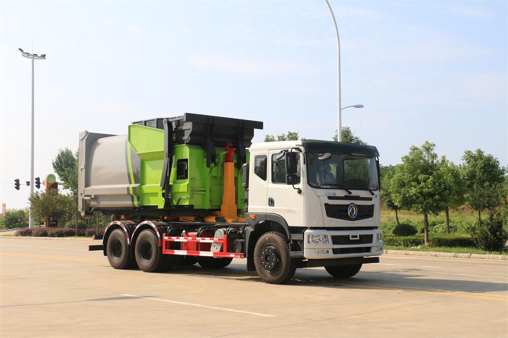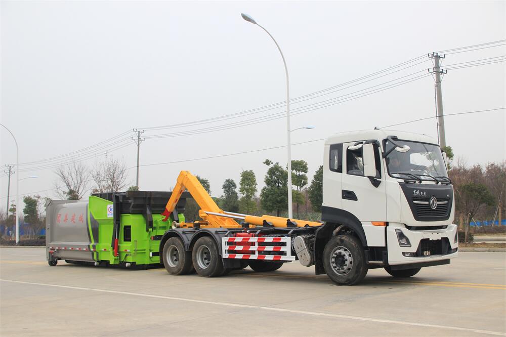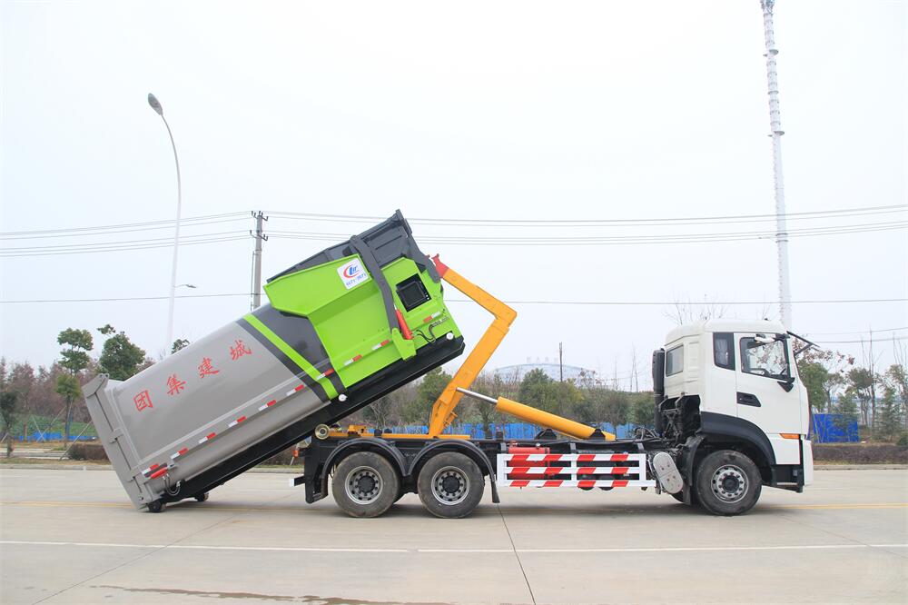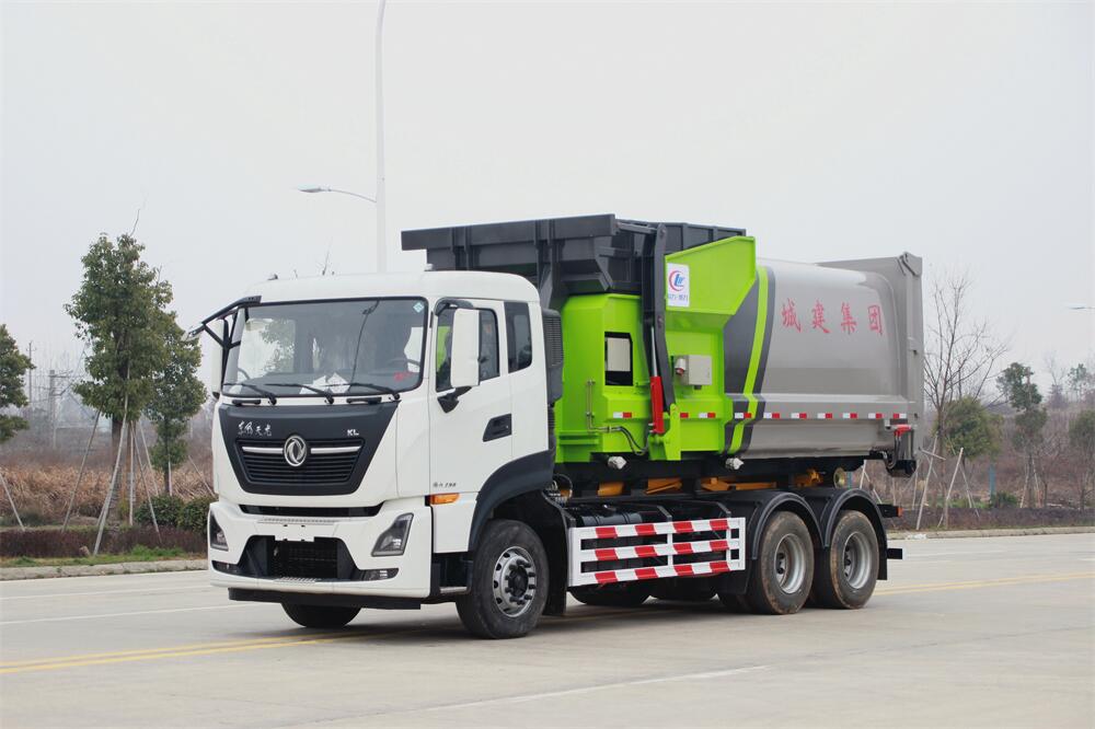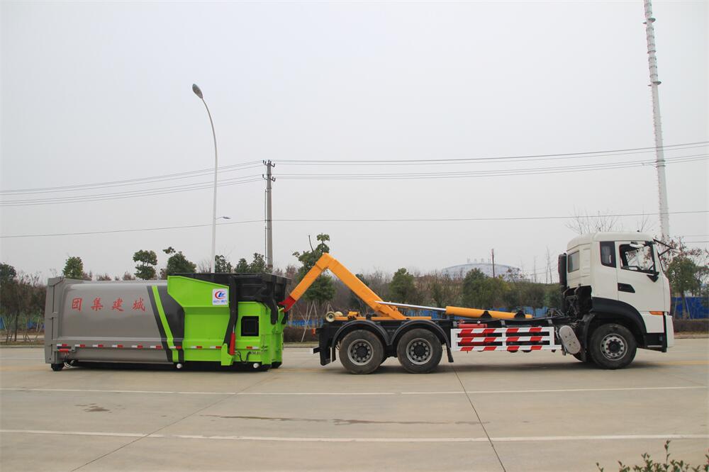 勾臂式垃圾車(車廂可卸式垃圾車)介紹: 車廂可卸式垃圾車又叫拉臂式垃圾車,是一種采用高新設(shè)計(jì)可伸縮的鉤臂,實(shí)現(xiàn)垃圾廂的二次吊裝,自吊上放下,可自行傾倒垃圾的環(huán)衛(wèi)設(shè)備。 拉臂式垃圾車結(jié)構(gòu)簡單,操作穩(wěn)定方便,裝卸效率高,機(jī)械化程度高,節(jié)省人力。鉤臂垃圾車一車可帶多個(gè)垃圾廂,在裝卸的運(yùn)輸過程中可有效地避免二次污染。 拉臂垃圾車采用高新設(shè)計(jì)可擺動(dòng)的鉤臂,垃圾箱由框架、開啟油缸、滑輪、后門和若干加強(qiáng)框架與鋼板焊接而成。調(diào)換貨廂快捷方便,貨廂上帶蓋(倒垃圾時(shí)可翻開),鉤臂垃圾車?yán)鴰w可選用碳鋼、不銹鋼材質(zhì)、內(nèi)部采取環(huán)氧樹脂防腐處理,改裝部分與原車底盤為可分離式,維修方便且保持了原車的機(jī)動(dòng)性及行駛性能。