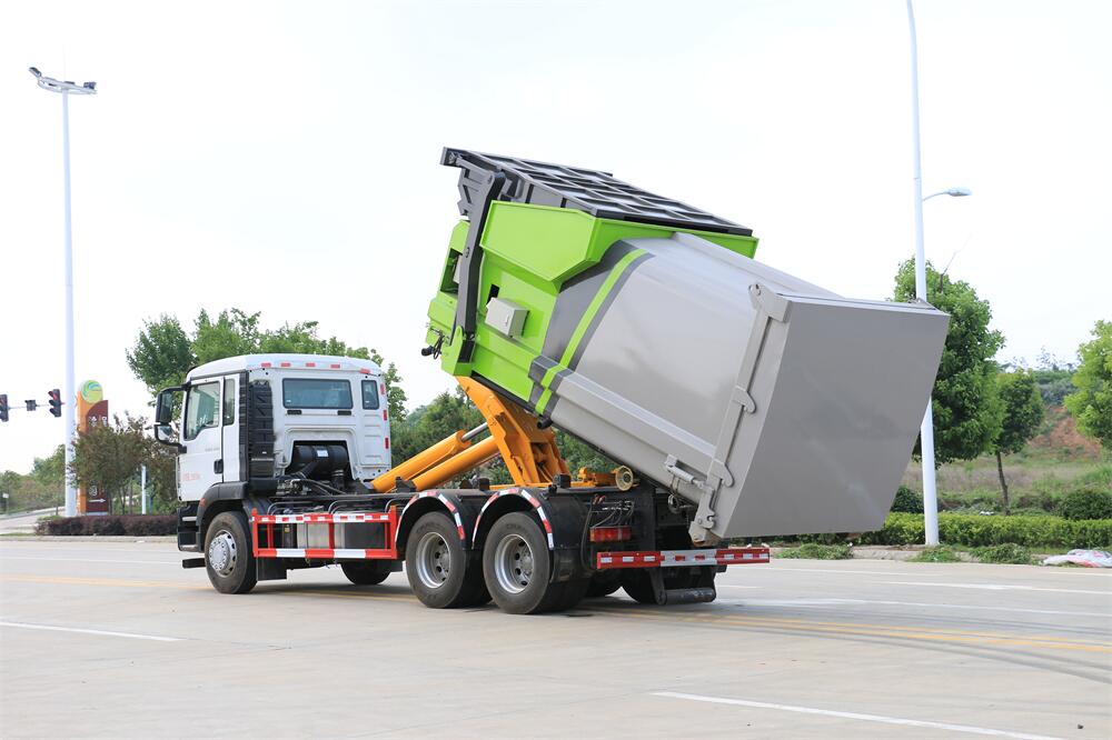 該款鉤臂式垃圾車由液壓系統(tǒng)、操作系統(tǒng)組成。舉升油制缸(1支)系國內知名液壓件廠家生產(chǎn)的雙作用油缸。垃圾廂可自吊上放下,可自行傾倒垃圾,上下一次工作循環(huán)時間≤50S。該車的特點是一個車能配多個垃圾廂,能實現(xiàn)一臺車與多個垃圾廂聯(lián)合作業(yè),循環(huán)運輸,充分提高了車輛的運輸能力。