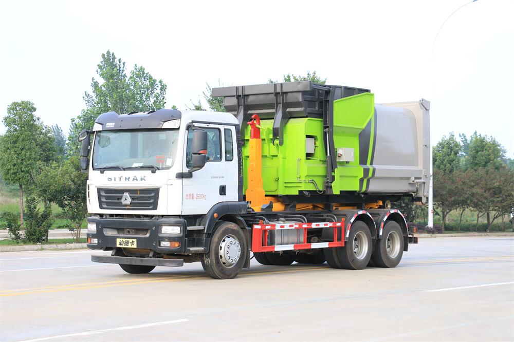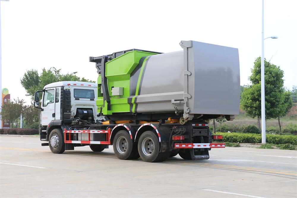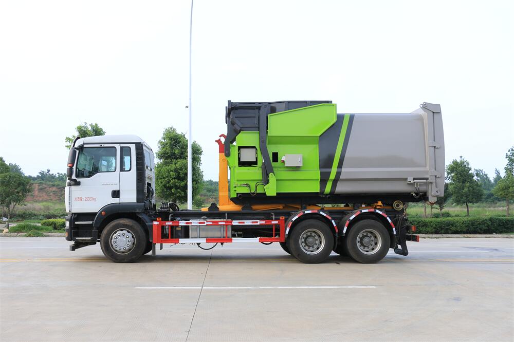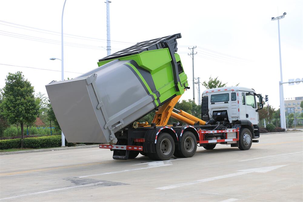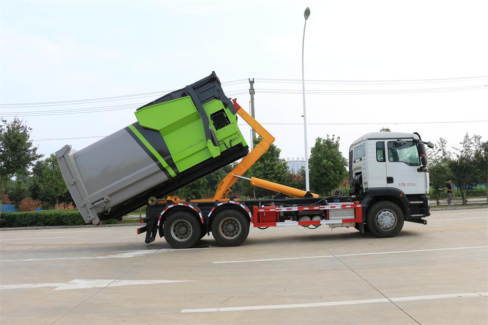 勾臂式垃圾車(車廂可卸式垃圾車)介紹: 車廂可卸式垃圾車又叫拉臂式垃圾車,是一種采用高新設計可伸縮的鉤臂,實現(xiàn)垃圾廂的二次吊裝,自吊上放下,可自行傾倒垃圾的環(huán)衛(wèi)設備。 拉臂式垃圾車結構簡單,操作穩(wěn)定方便,裝卸效率高,機械化程度高,節(jié)省人力。鉤臂垃圾車一車可帶多個垃圾廂,在裝卸的運輸過程中可有效地避免二次污染。 拉臂垃圾車采用高新設計可擺動的鉤臂,垃圾箱由框架、開啟油缸、滑輪、后門和若干加強框架與鋼板焊接而成。調換貨廂快捷方便,貨廂上帶蓋(倒垃圾時可翻開),鉤臂垃圾車垃圾廂體可選用碳鋼、不銹鋼材質、內部采取環(huán)氧樹脂防腐處理,改裝部分與原車底盤為可分離式,維修方便且保持了原車的機動性及行駛性能。