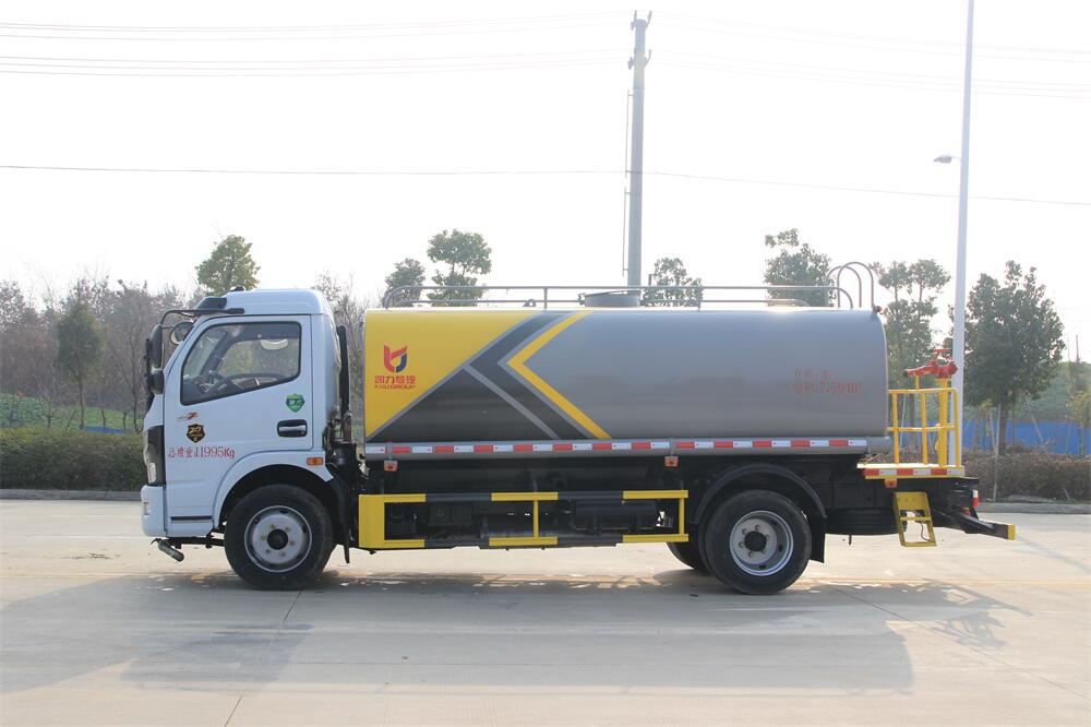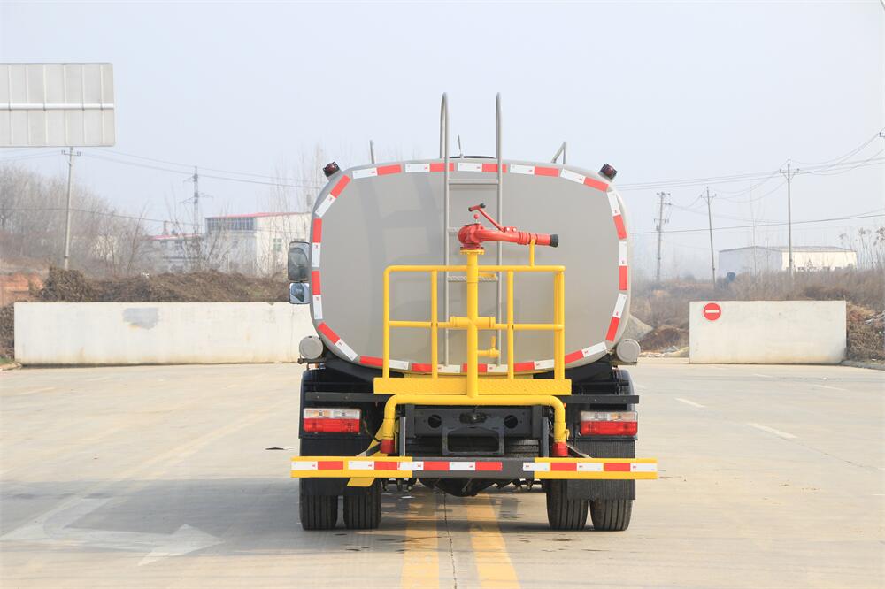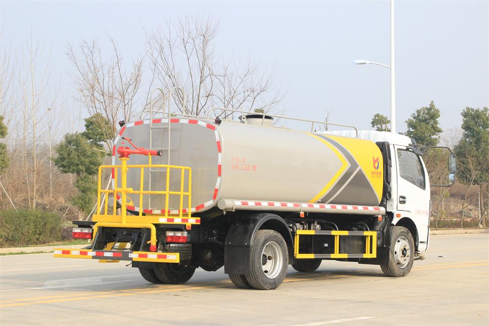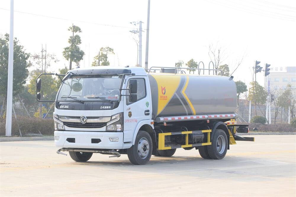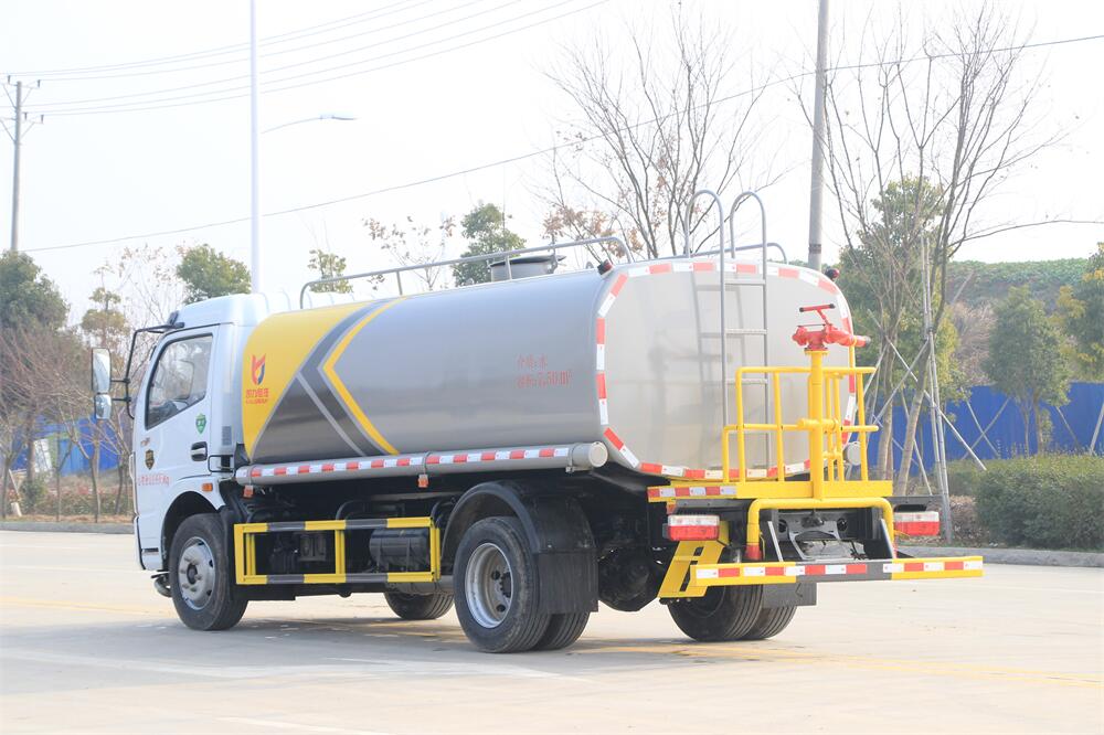 灑水車前裝有鴨形噴嘴或圓頭沖嘴,后面裝有圓柱開(kāi)灑水噴嘴或蓮蓬頭噴嘴,后部有一工作平臺(tái),裝配有水炮。后部還可裝8個(gè)噴嘴(選裝)。