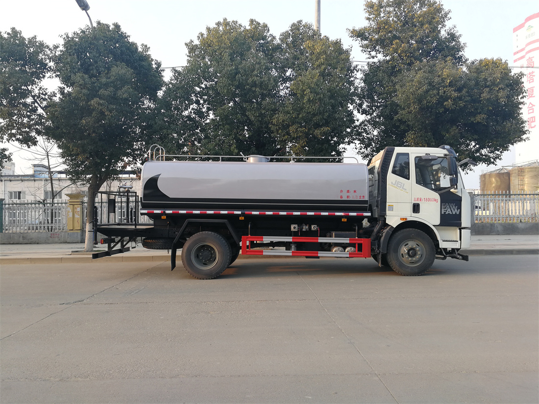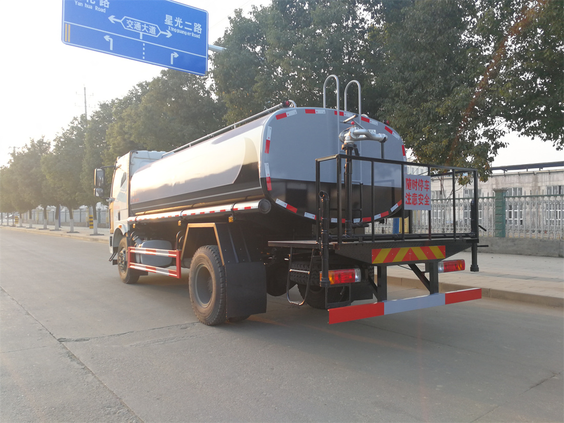 灑水車前裝有鴨形噴嘴或圓頭沖嘴,后面裝有圓柱開灑水噴嘴或蓮蓬頭噴嘴,后部有一工作平臺(tái),裝配有水炮。后部還可裝8個(gè)噴嘴(選裝)。