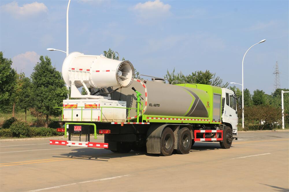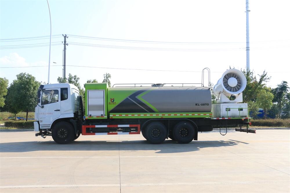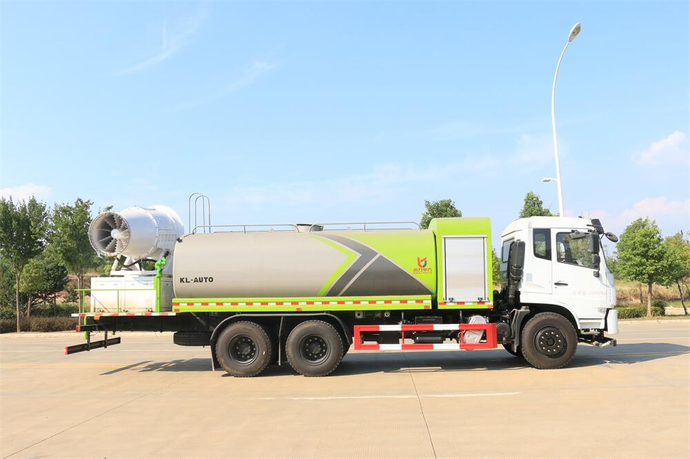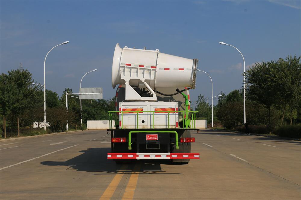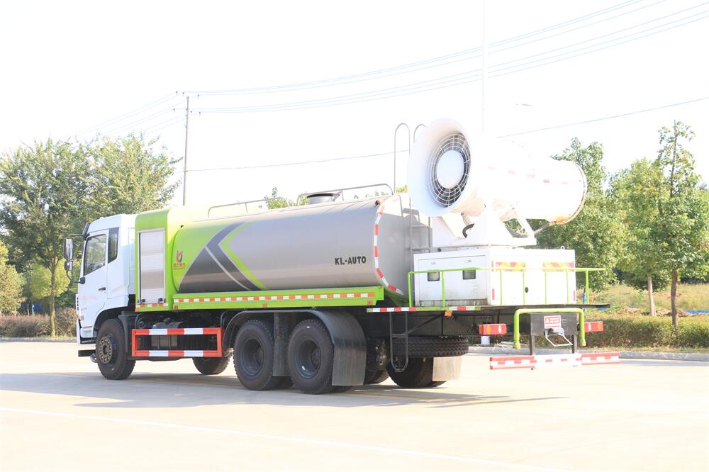 上裝配置:罐體容積為 16立方,選配風(fēng)送式霧炮機(jī)組射程30米、40米、50米、60米、80米、100米、120米霧炮,罐體鋼板為4mm碳鋼Q235材質(zhì),罐內(nèi)隔板具有防波作用,以減輕汽車(chē)行駛時(shí)罐體液體沖擊,罐體及整車(chē)外形尺寸按照公告。帶大功率專(zhuān)用灑水泵,泵可自吸自排,整車(chē)前沖、后灑、側(cè)噴、帶65消防接口,后平臺(tái)配CLW-50、CLW-60、CLW-80、CLW-100、CLW-120型風(fēng)送式霧炮機(jī)組;罐體前封頭配大功率柴油發(fā)電機(jī)組;前封頭帶水位計(jì),后平臺(tái)主管路帶1寸澆花接口,后爬梯。帶兩根輸水管及陰陽(yáng)端。罐體顏色:銀/灰/綠,罐體兩側(cè)噴“多功能抑塵車(chē)”字樣,貼反光標(biāo)示。