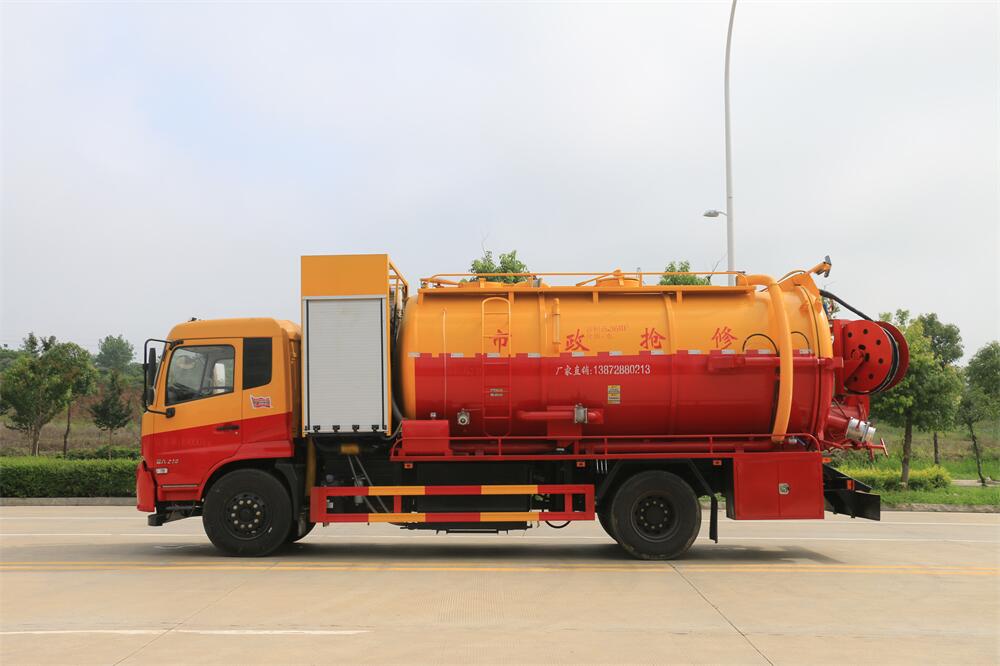 上裝配置:清水罐約 5 立方,污水罐約 10 立 方;罐體 8mm 厚,封頭 8mm 厚,水罐、污罐可 互通,用 100 球閥**開關;清洗部份采用天 津通潔高壓泵,壓力 19Mpa,流量 215L/min, 配 80 米直徑 22 高壓管帶液壓卷盤;吸污部份 采用濰柴375馬力副發動機帶山東SK-30水循 環泵(副發自帶),吸污罐帶舉升,后封頭焊 死(可選擇后封頭全開),尾部加裝一個 600mm 快開,罐體后尾部一個 DN150 排污口球閥,一 個 DN100 吸污球閥帶出口盤,一個視污窗,一 根 10m 吸污管,一套陰陽端,壓力表,防溢 閥,箭頭燈,工具箱,淋管裝置,高壓泵帶氣 吹水。配一個 4.5 公斤水雷噴頭,另帶一個 80 公分手持洗車噴頭。