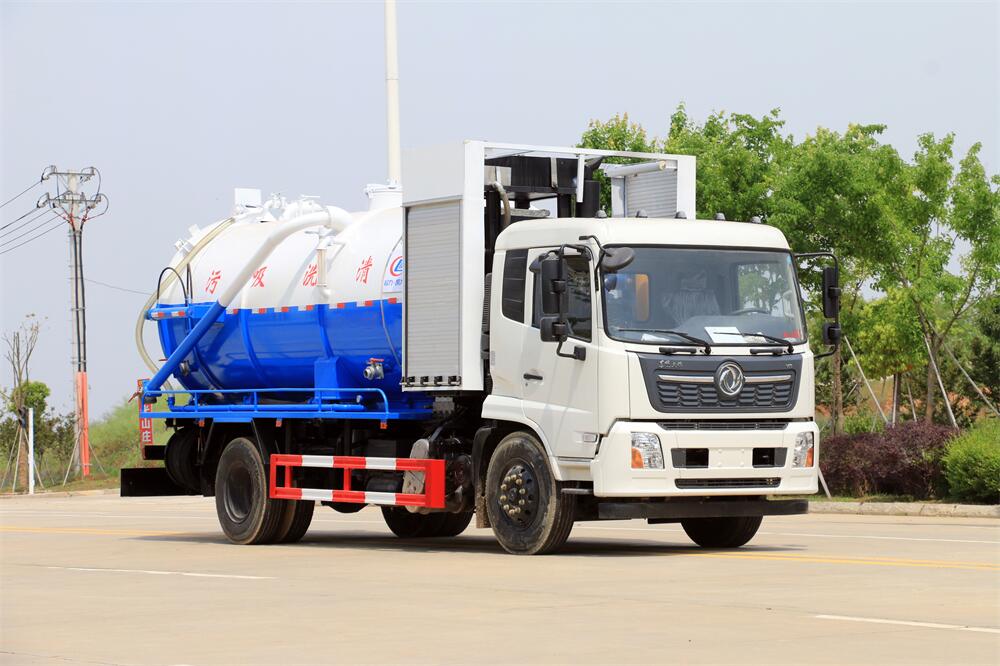 上裝配置:清水罐約 5 立方,污水罐約 10 立 方;罐體 8mm 厚,封頭 8mm 厚,水罐、污罐可 互通,用 100 球閥**開關;清洗部份采用天 津通潔高壓泵,壓力 19Mpa,流量 215L/min, 配 80 米直徑 22 高壓管帶液壓卷盤;吸污部份 采用濰柴375馬力副發動機帶山東SK-30水循 環泵(副發自帶),吸污罐帶舉升,后封頭焊 死(可選擇后封頭全開),尾部加裝一個 600mm 快開,罐體后尾部一個 DN150 排污口球閥,一 個 DN100 吸污球閥帶出口盤,一個視污窗,一 根 10m 吸污管,一套陰陽端,壓力表,防溢 閥,箭頭燈,工具箱,淋管裝置,高壓泵帶氣 吹水。配一個 4.5 公斤水雷噴頭,另帶一個 80 公分手持洗車噴頭。