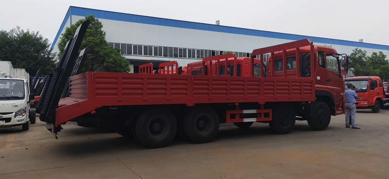 東風商用后八輪平板車,玉柴270馬力,陜齒10檔,153后橋,軸距4350+1300,1000鋼絲胎,整車長10.550米寬2.55米高3.06米。可以拉28噸以下挖機