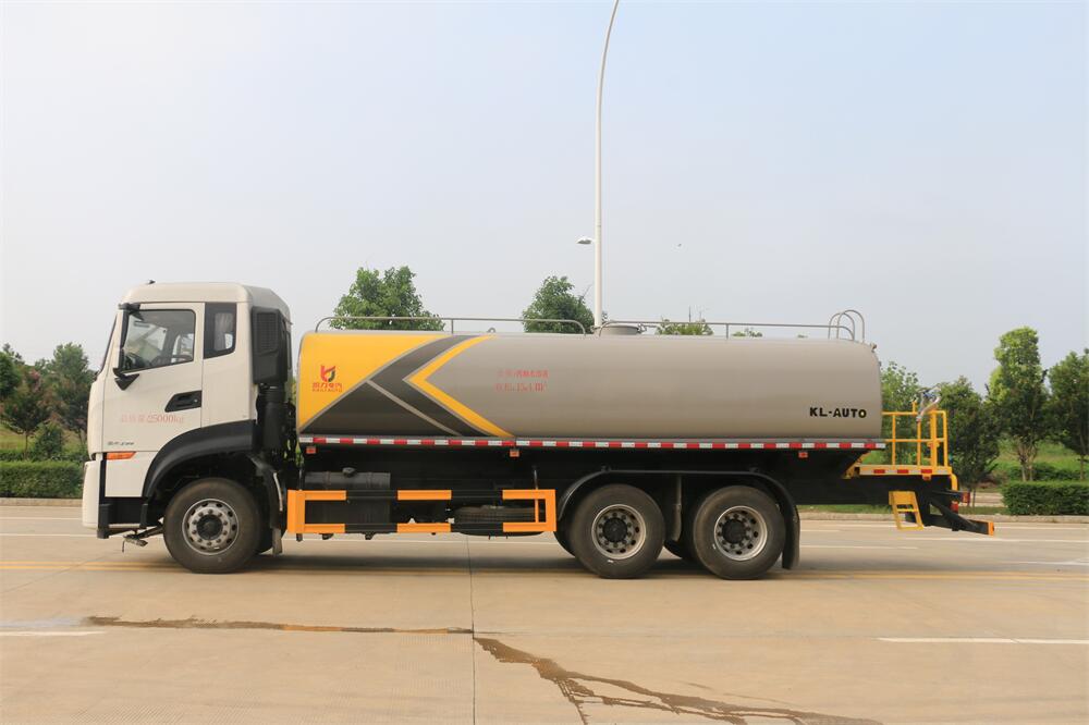 灑水車前裝有鴨形噴嘴或圓頭沖嘴,后面裝有圓柱開灑水噴嘴或蓮蓬頭噴嘴,后部有一工作平臺,裝配有水炮。后部還可裝8個噴嘴(選裝)。